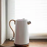 Die Ferienhaus Auszeit Natur hat eine voll ausgestattete Küchenzeile mit einem Wasserkocher, einem Kühlschrank und einem Herd.